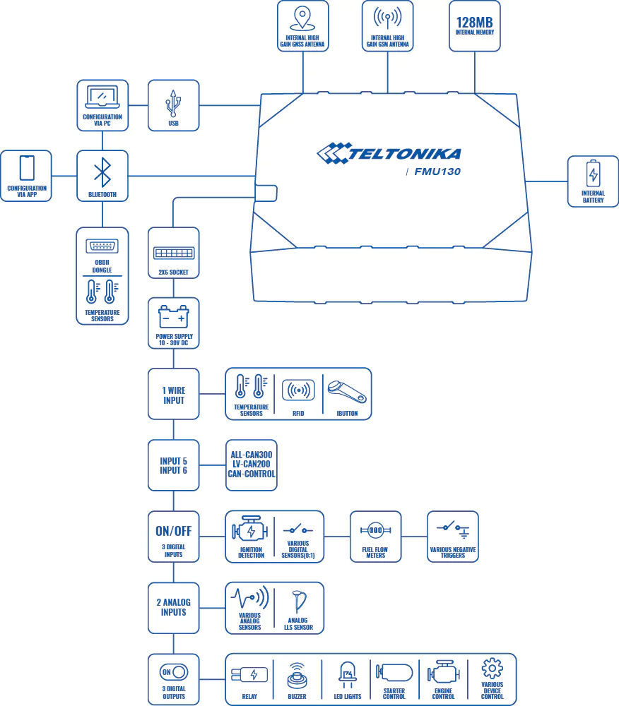 FMU130 es un terminal de seguimiento en tiempo real pequeño y profesional con conectividad GNSS y 3G / GSM y batería de respaldo. Dispositivo equipado con GNSS / Bluetooth y módulos 3G, GNSS interno, 3G antenas, digitales configurables, entradas analógicas y salidas digitales, entrada negativa, entradas de impulso.
